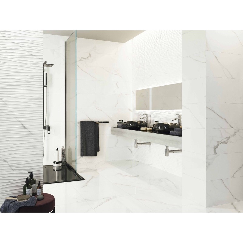 Bashful. A range of large format, gloss ceramic wall and floor tiles that feature a subtle marble vein. Available in 30x90cm for the walls with a stunning decor, and a 60x60cm floor tile to match.