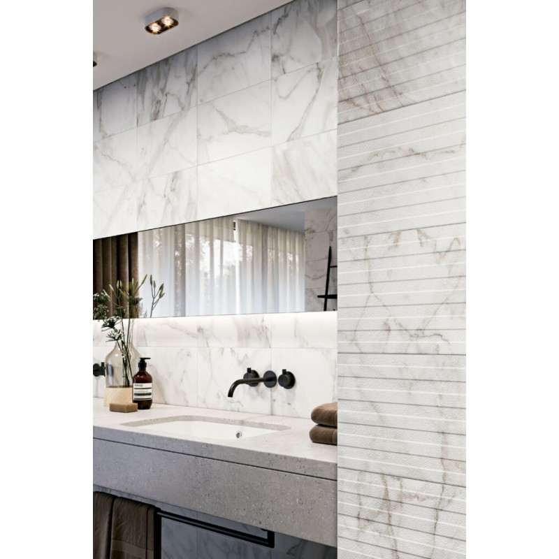 Calacatta. A classic, marble imitation matt ceramic wall tile, with a corresponding decor to match.