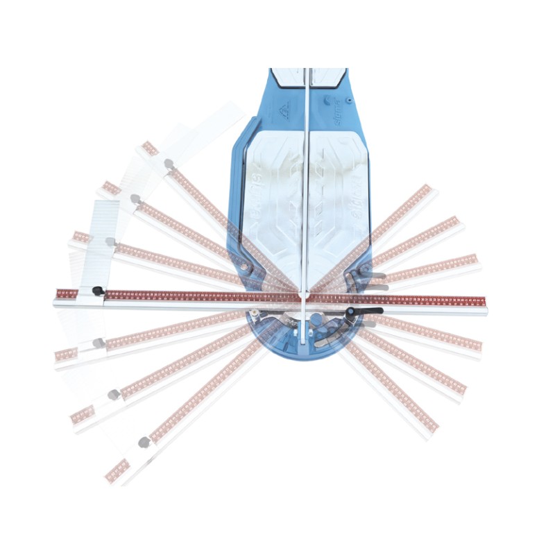 Featuring a large tile support table and swivelling measurement bar which supports the tile, it can rotate 45° in both directions and is pivoted at the centre of the cutting line, allowing the real measurement of the piece to be cut to be obtained.